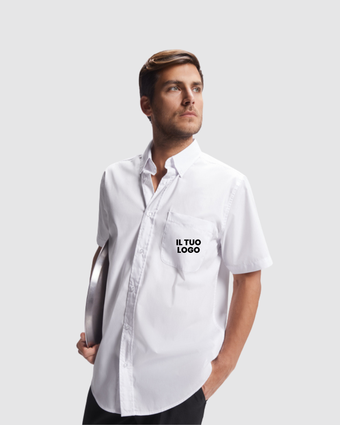 Camicia manica corta e colletto classico botton down. Taschino frontale lato sinistro. Abbottonatura con 7 bottoni in tinta e bordo inferiore