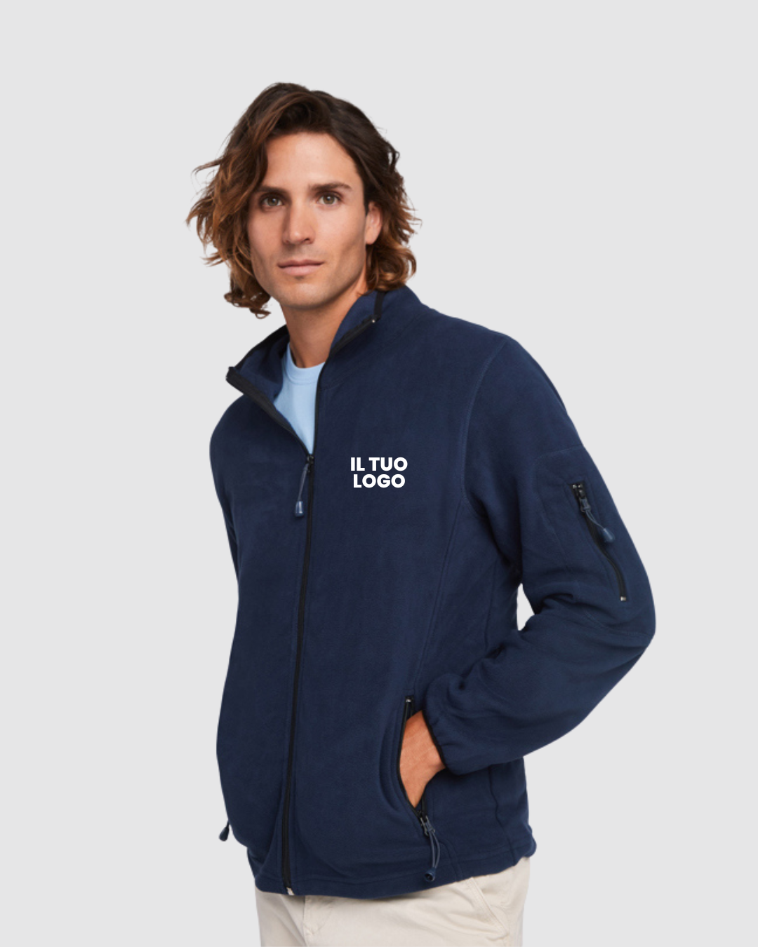 Giacca sportiva in pile per il tempo libero, collo alto e maniche lunghe ribattute in contrasto. Tasca con zip sulla manica sinistra e cerniera