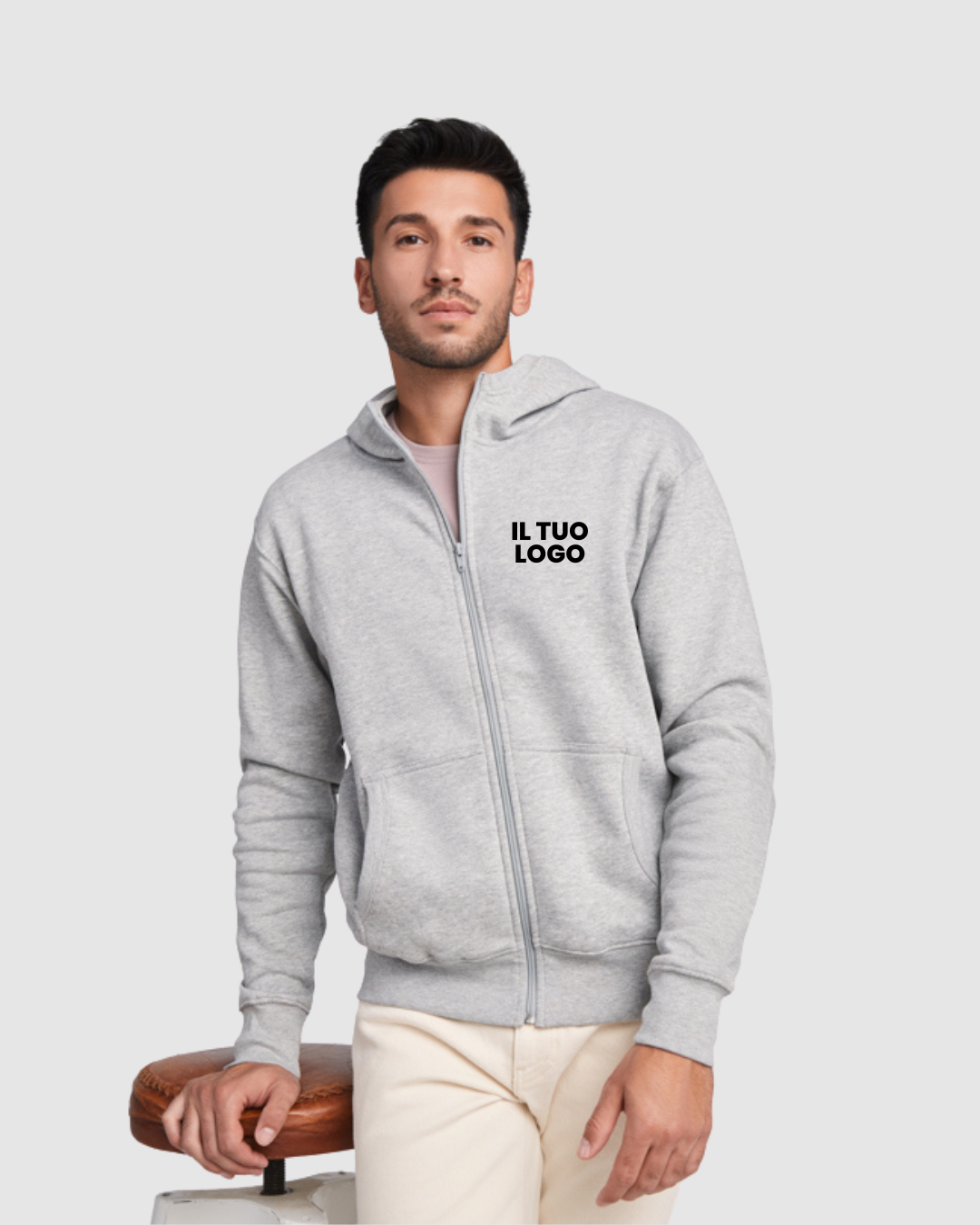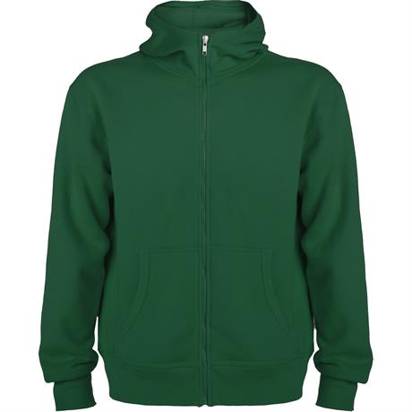 Felpa stile casual con cappuccio. Cerniera lunga. Dettagli in costina attorno al cappuccio. Tasca a canguro. Polsini e girovita in costina 2x2